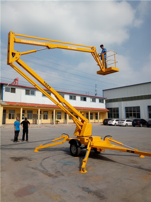 四川客戶來驗收的這臺拖車折臂式液壓升降平臺,升高14米,載重260公斤,最大延伸工作距離2-8米,它的動力電源可采用柴油機,電瓶,及汽油機.