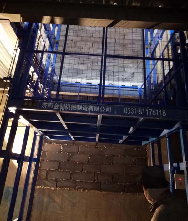 液壓升降貨梯生產制造廠家-濟南金創機械制造有限公司,為威海客戶定做的升高13米,載重5噸的導軌鏈條式液壓升降貨梯,嚴寒天氣下,經過安裝師傅加班加點的努力,昨天下午通過了客戶方的驗收工作。